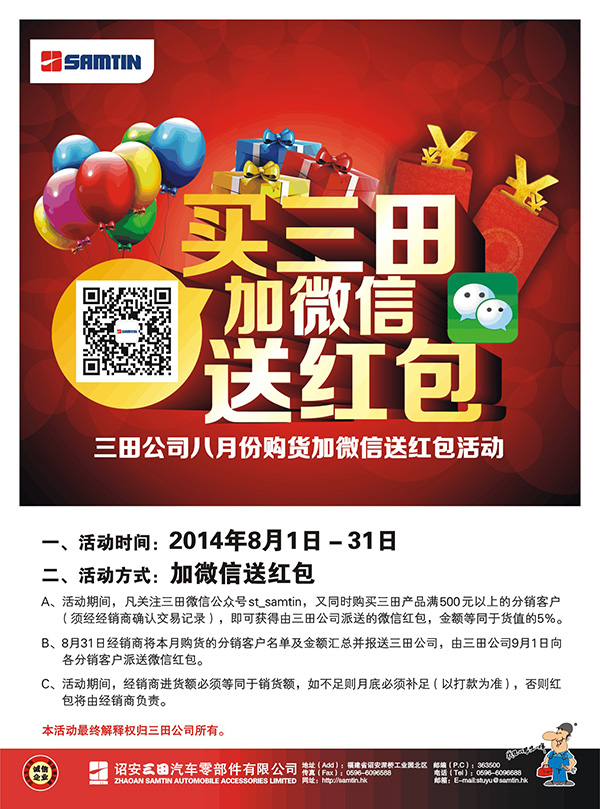 A、活動(dòng)期間,凡關(guān)注三田微信公眾號(hào)st_samtin,又同時(shí)購(gòu)買三田產(chǎn)品滿500元以上的分銷客戶(須經(jīng)經(jīng)銷商確認(rèn)交易記錄),即可獲得由三田公司派送的微信紅包,金額等同于貨值的5%。